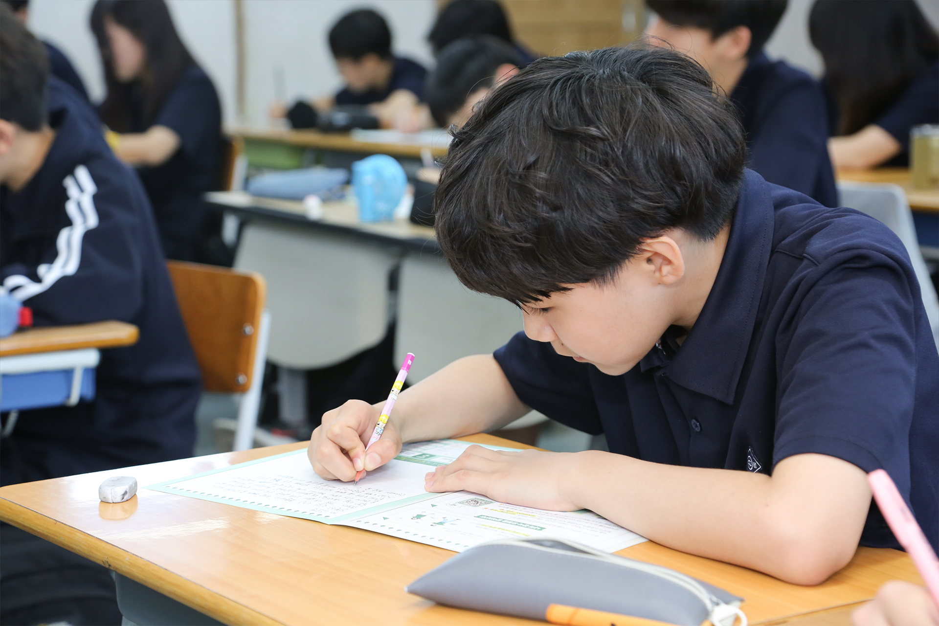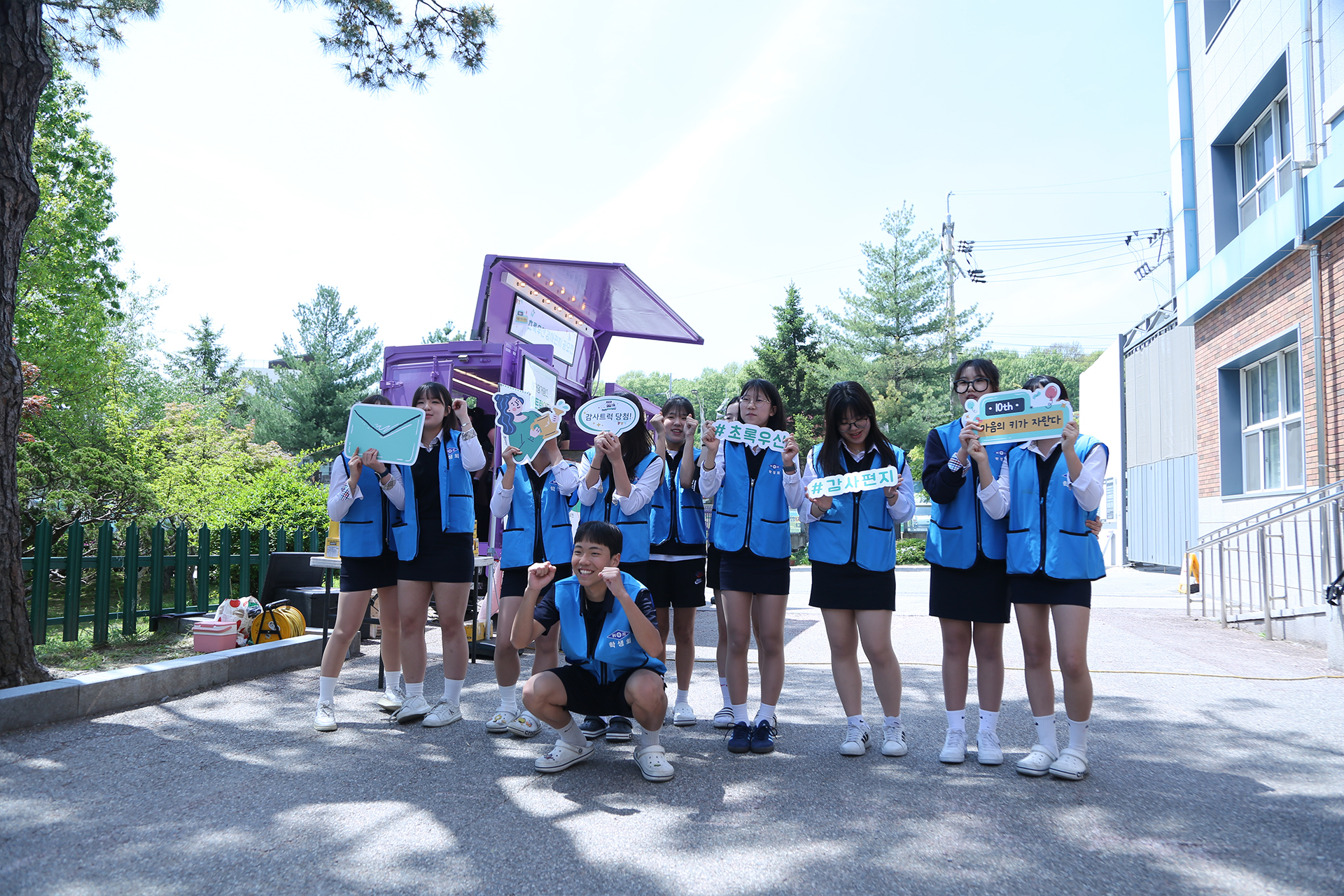 사회자(조수아 아나운서), 강연자(김소정PD), 내빈(초록우산 본부장, 이천중학교 교장), 이천중학교 학생